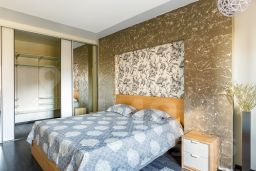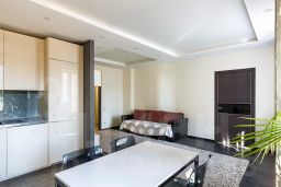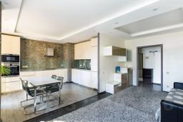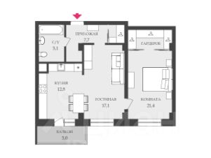 Планировка квартиры включает в себя кухню с гостиной зоной и выходом на лоджию, просторную спальню с гардеробной, совмещенный санузел и прихожую.