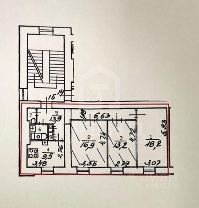 - 3 изолированные комнаты правильной формы: 13,2 + 16,9 + 18,2 кв. м.