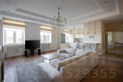 Правильная форма помещения, окна на Манежную площадь, действующий камин здесь комфортно проводить вечера, принимать гостей и обсуждать за ужином с семьей прошедший день. А утром пить кофе с видом на фонтан, сидя за широким подоконником. Здесь же основной вход в квартиру и один из трех санузлов.