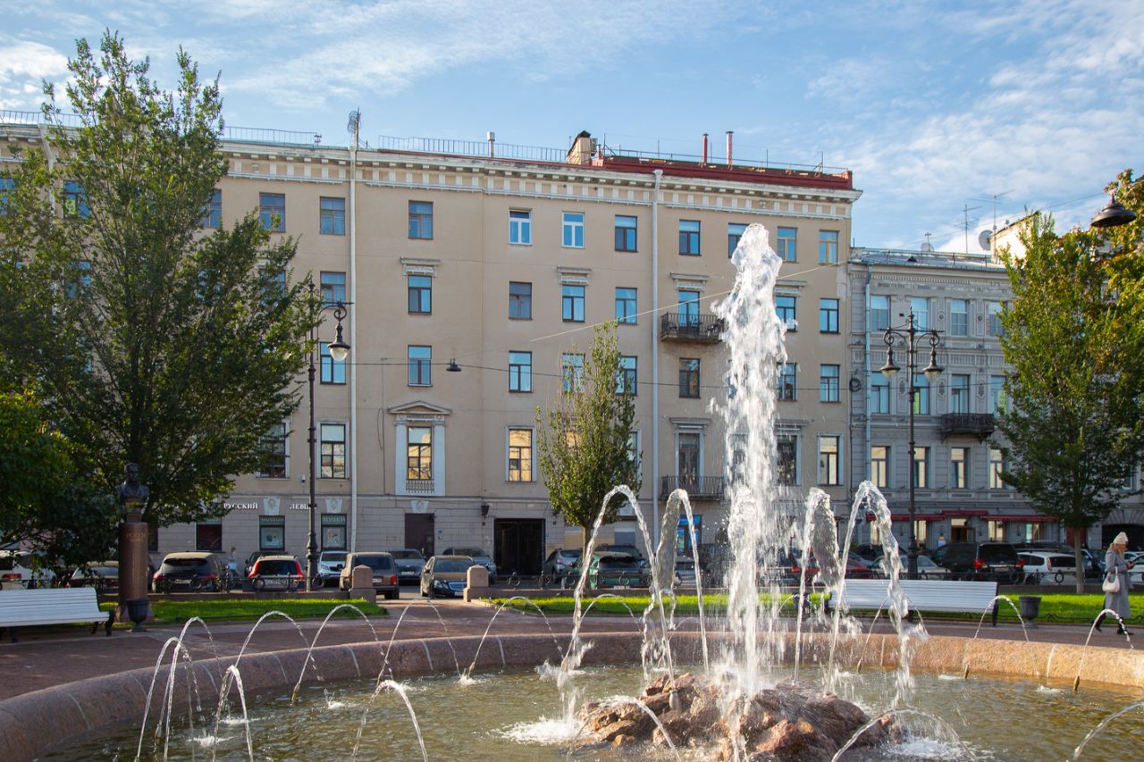 В центре площади в идеальный круг, словно выложенный паркетом, вписан аккуратный круглый фонтан, струящийся прозрачной водой. Следующий круг бюсты зодчих, которые возвели парадный Петербург. Росси, Кваренги, Ринальди и Растрелли смотрят в вашу сторону. Тихий сквер с зеленой травой и россыпью теней от раскидистых деревьев смягчает картину, а обрамляют площадь старинные строгие фасады зданий, стоящих плечом к плечу. Это почти идеальный вид в исторической части Петербурга.