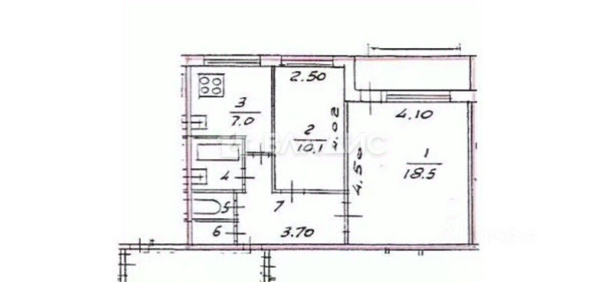 Общая площадь 45,5 м², жилая — 27 м², кухня — 7 м²