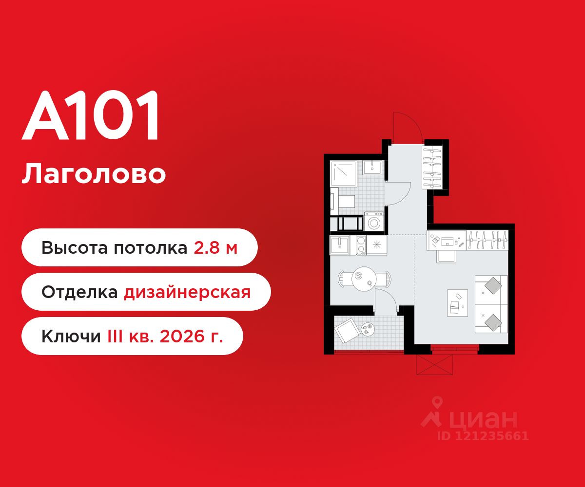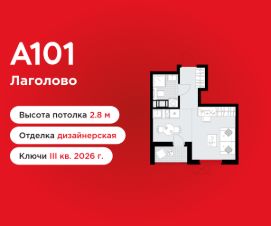 Студия площадью 24.30 в ЖК "А101 Лаголово" c лоджией на 3 этаже. Квартира с отделкой. Вид из окна во двор. В квартире 1 санузел. Высота потолков 2.8 м.