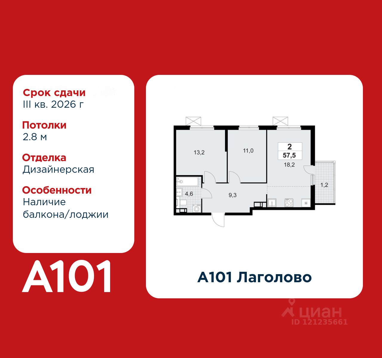 2-комнатная квартира площадью 57.50 в ЖК "А101 Лаголово" c лоджией на 3 этаже. Квартира с отделкой. Вид из окна во двор. В квартире 1 санузел. Высота потолков 2.8 м.