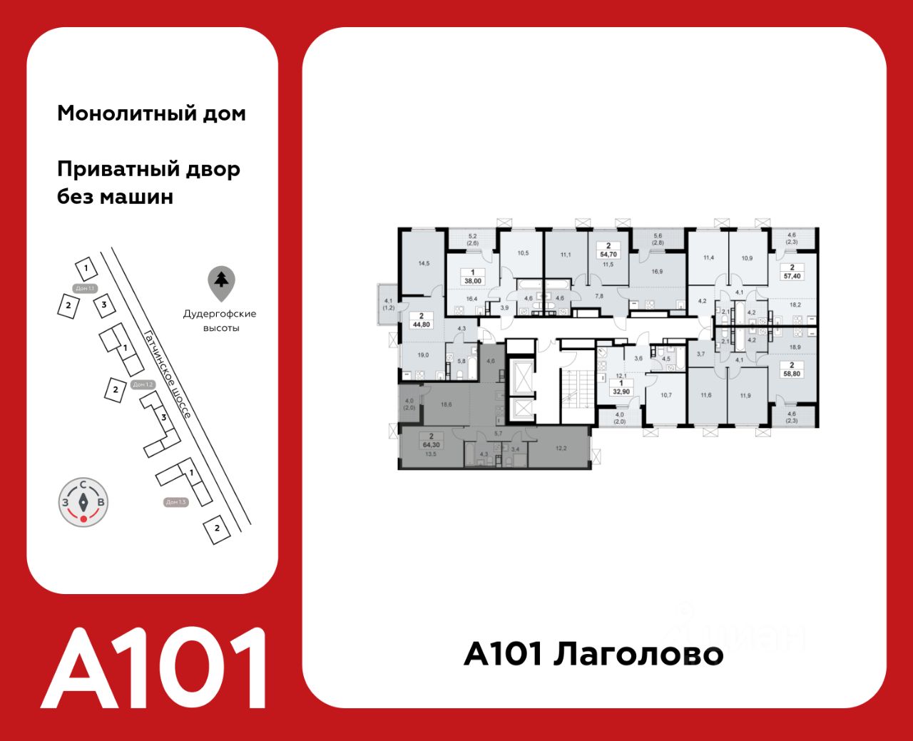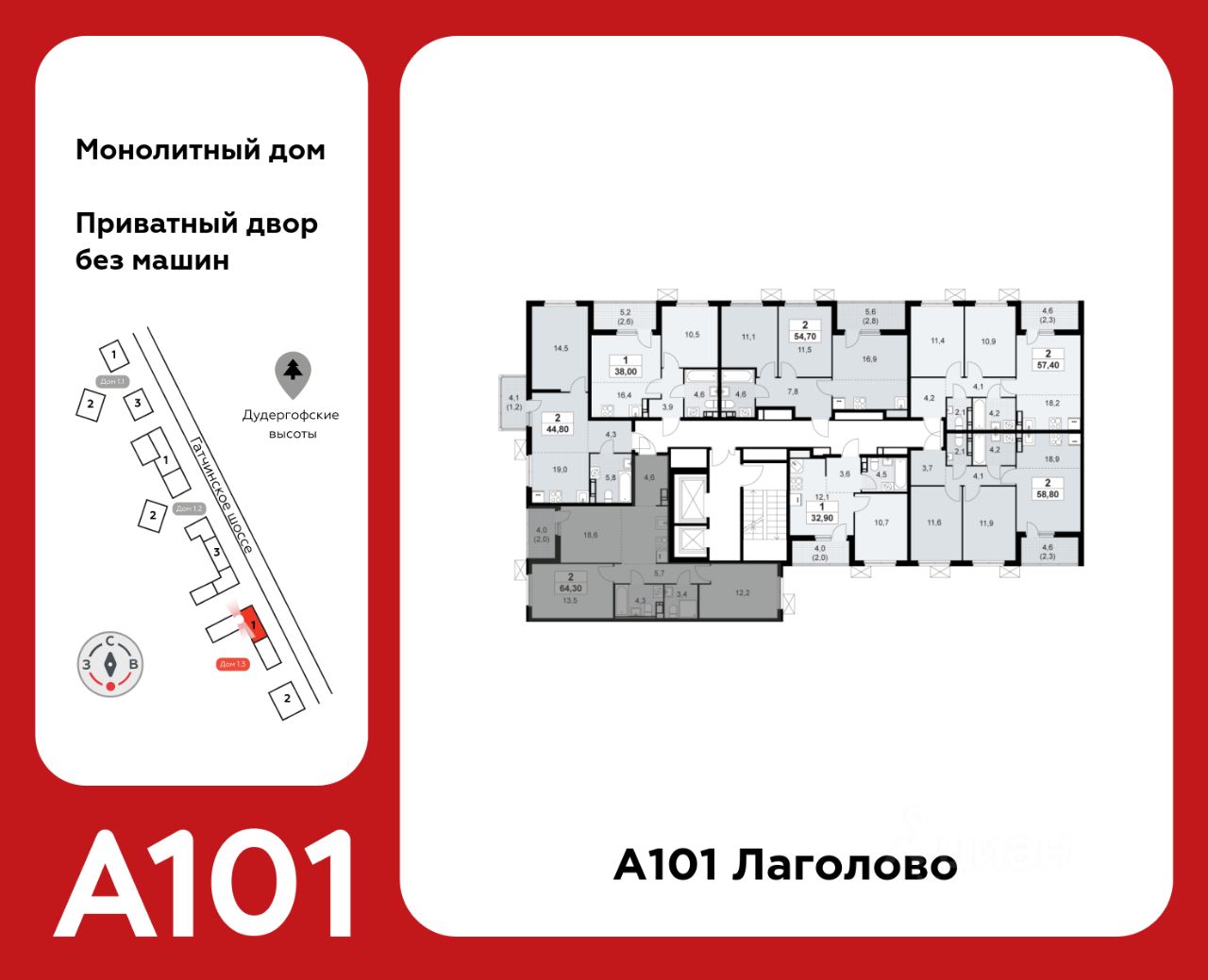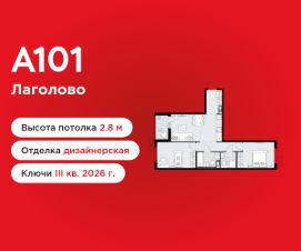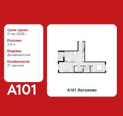 2-комнатная квартира площадью 64.30 в ЖК "А101 Лаголово" c лоджией на 6 этаже. Квартира с отделкой. Вид из окна во двор. В квартире 2 санузла. Высота потолков 2.8 м.
