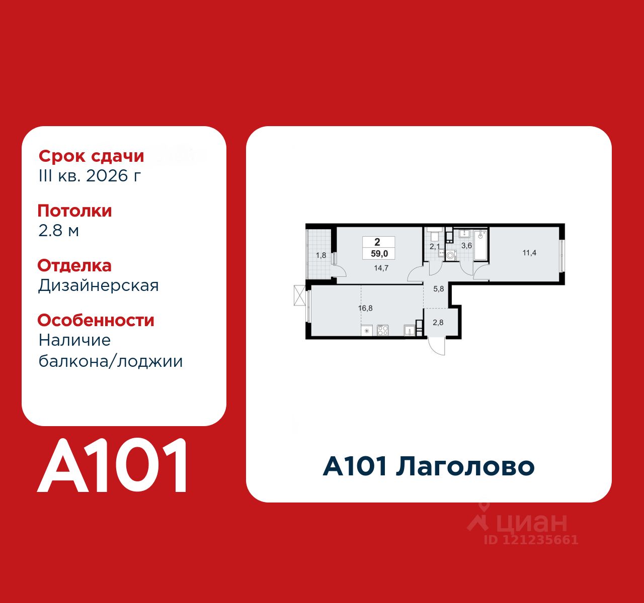 2-комнатная квартира площадью 59.00 в ЖК "А101 Лаголово" c лоджией на 5 этаже. Квартира с отделкой. Вид из окна во двор. В квартире 1 санузел. Высота потолков 2.8 м. Ключи в 2025 году.