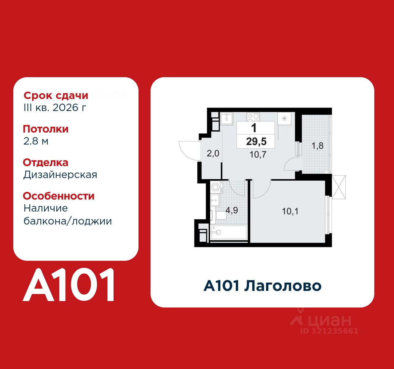 1-комнатная квартира площадью 29.50 в ЖК "А101 Лаголово" c лоджией на 9 этаже. Квартира с отделкой. Вид из окна во двор. В квартире 1 санузел. Высота потолков 2.8 м.