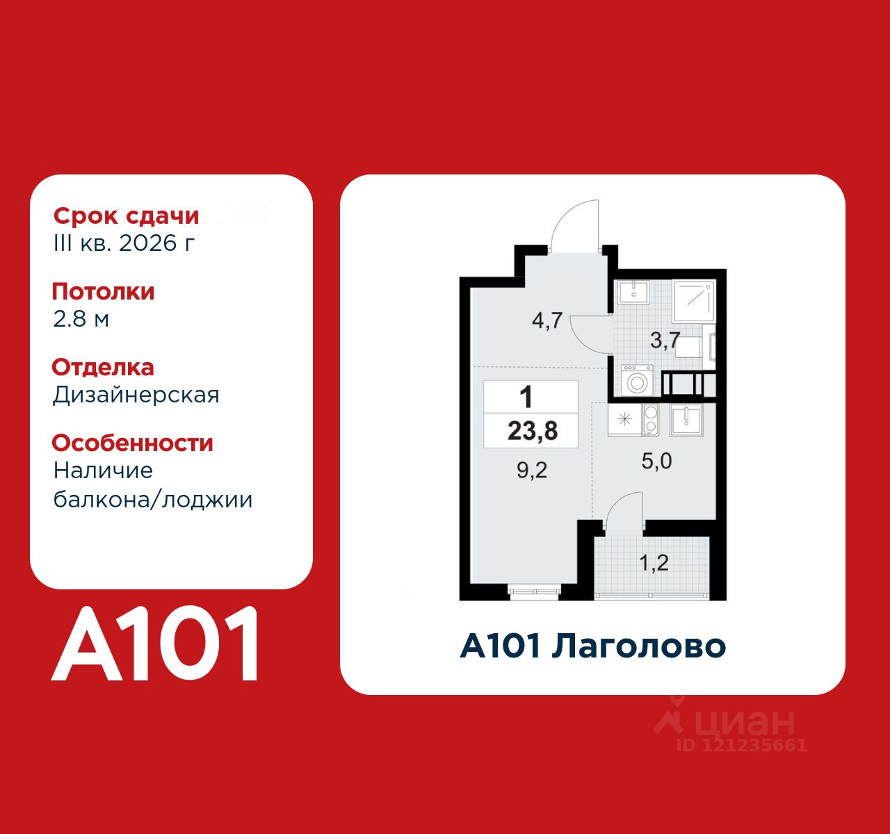 Студия площадью 23.80 в ЖК "А101 Лаголово" c лоджией на 4 этаже. Квартира с отделкой. Вид из окна на улицу. В квартире 1 санузел. Высота потолков 2.8 м.