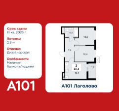 2-комнатная квартира площадью 46.40 в ЖК "А101 Лаголово" c лоджией на 11 этаже. Квартира с отделкой. Вид из окна на улицу. В квартире 1 санузел. Высота потолков 2.8 м.