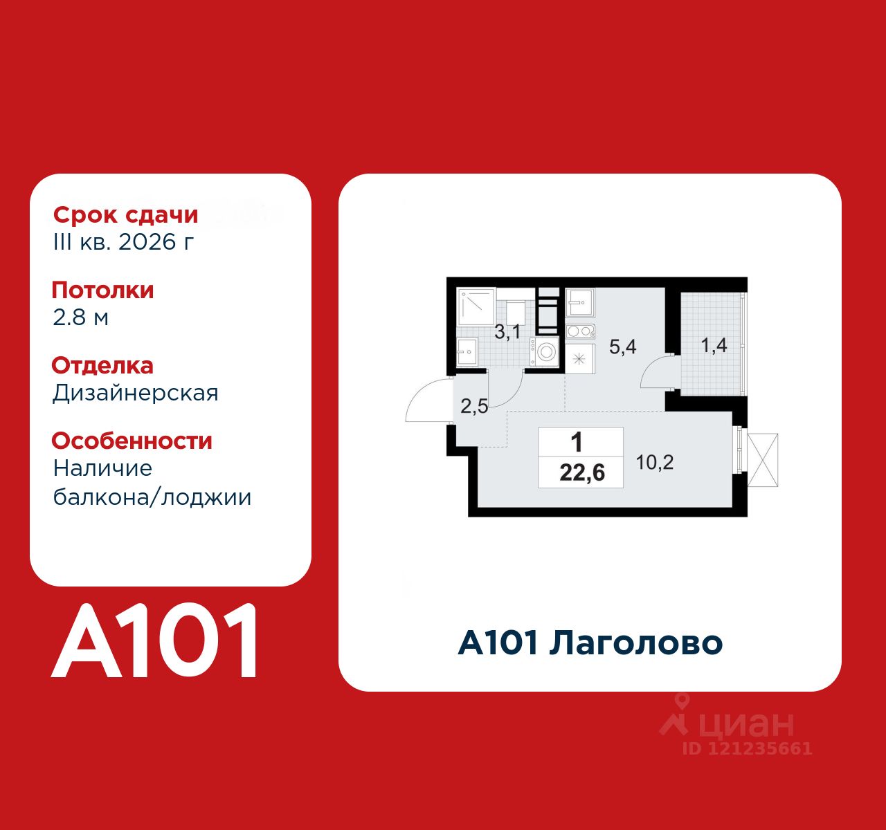 Студия площадью 22.60 в ЖК "А101 Лаголово" c лоджией на 11 этаже. Квартира с отделкой. Вид из окна во двор. В квартире 1 санузел. Высота потолков 2.8 м.