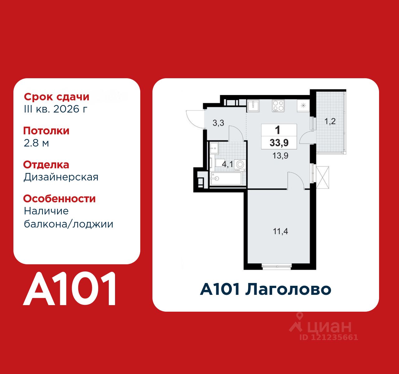 1-комнатная квартира площадью 33.90 в ЖК "А101 Лаголово" c лоджией на 6 этаже. Квартира с отделкой. Вид из окна на улицу. В квартире 1 санузел. Высота потолков 2.8 м. Ключи в 2025 году.