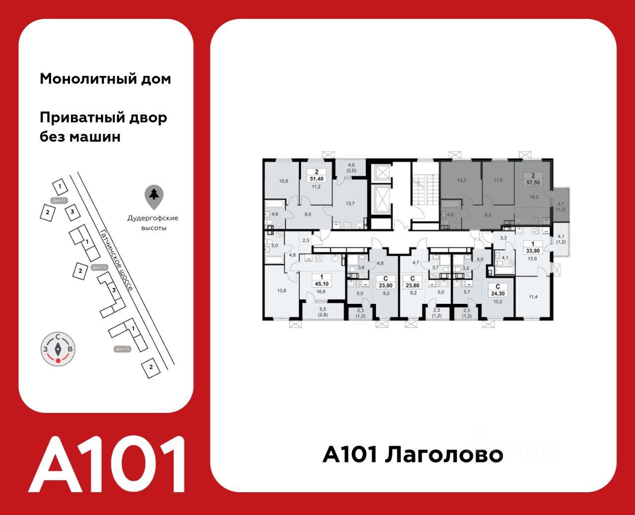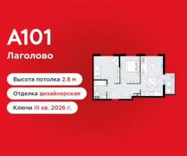 2-комнатная квартира площадью 57.50 в ЖК "А101 Лаголово" c лоджией на 6 этаже. Квартира с отделкой. Вид из окна во двор. В квартире 1 санузел. Высота потолков 2.8 м.