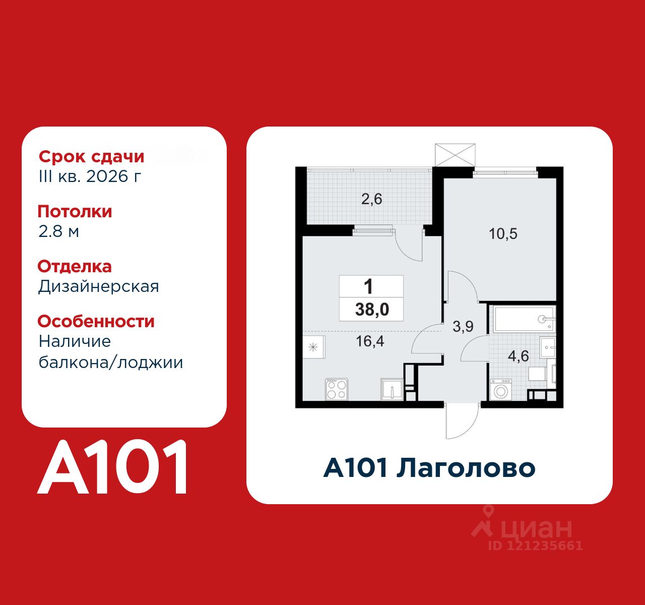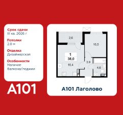 1-комнатная квартира площадью 38.00 в ЖК "А101 Лаголово" c лоджией на 11 этаже. Квартира с отделкой. Вид из окна на улицу. В квартире 1 санузел. Высота потолков 2.8 м. Ключи в 2025 году.