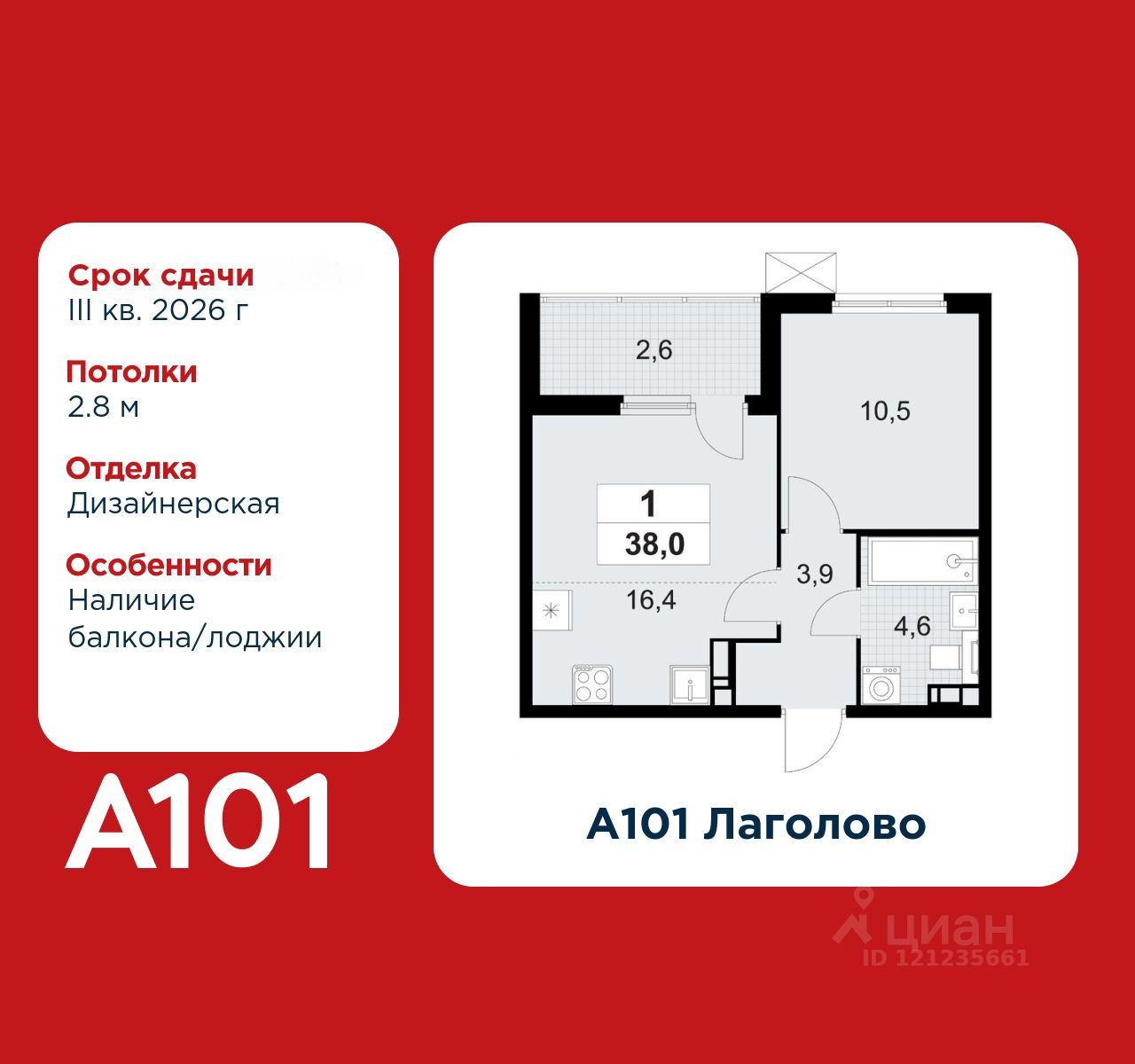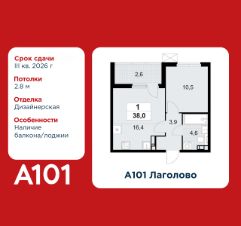 1-комнатная квартира площадью 38.00 в ЖК "А101 Лаголово" c лоджией на 11 этаже. Квартира с отделкой. Вид из окна во двор. В квартире 1 санузел. Высота потолков 2.8 м.