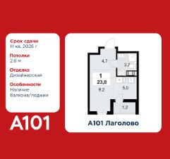 Студия площадью 23.80 в ЖК "А101 Лаголово" c лоджией на 10 этаже. Квартира с отделкой. Вид из окна на улицу. В квартире 1 санузел. Высота потолков 2.8 м.