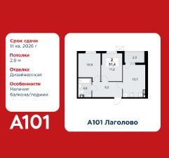 2-комнатная квартира площадью 51.40 в ЖК "А101 Лаголово" c лоджией на 10 этаже. Квартира с отделкой. Вид из окна на улицу. В квартире 1 санузел. Высота потолков 2.8 м.