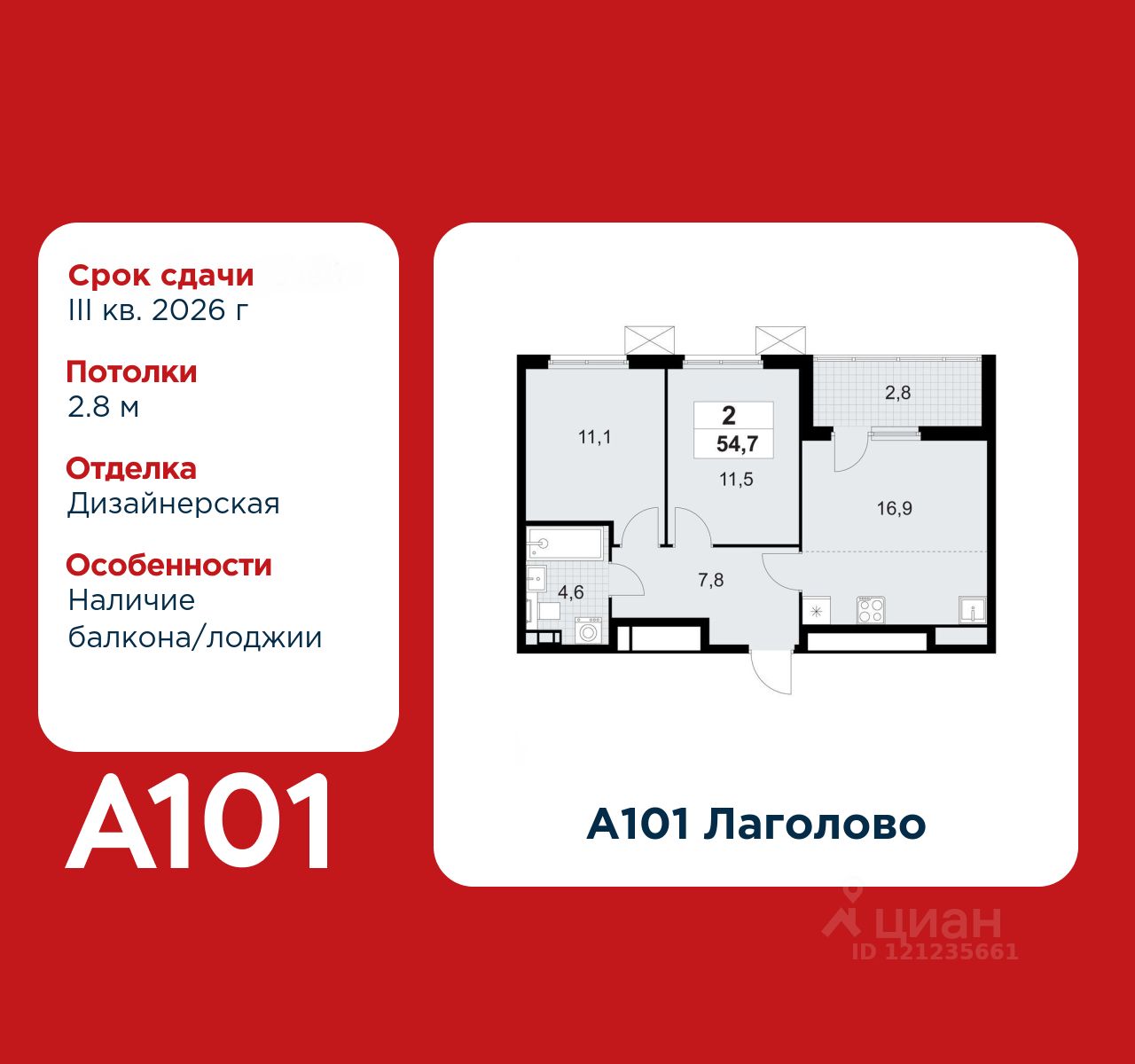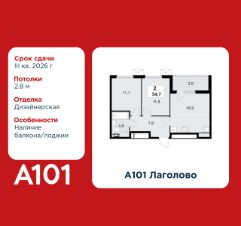 2-комнатная квартира площадью 54.70 в ЖК "А101 Лаголово" c лоджией на 3 этаже. Квартира с отделкой. Вид из окна во двор. В квартире 1 санузел. Высота потолков 2.8 м.