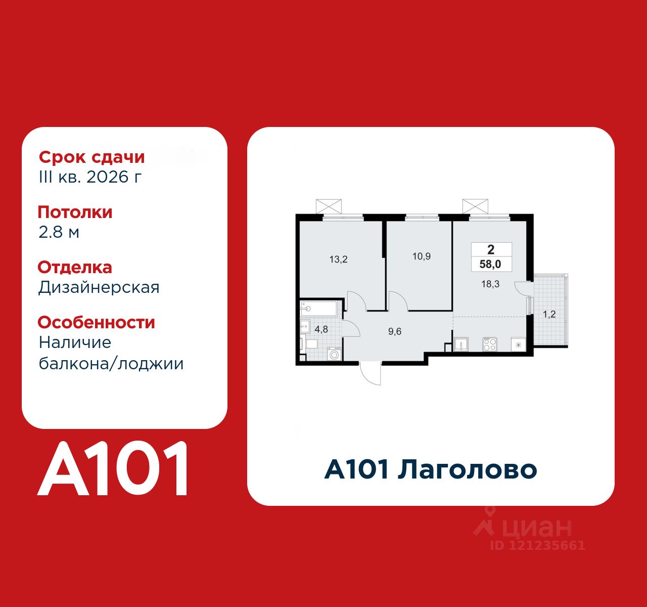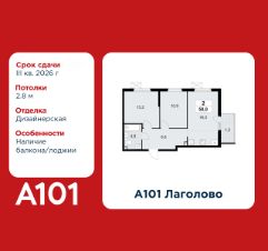 2-комнатная квартира площадью 58.00 в ЖК "А101 Лаголово" c лоджией на 2 этаже. Квартира с отделкой. Вид из окна во двор. В квартире 1 санузел. Высота потолков 2.8 м. Ключи в 2025 году.