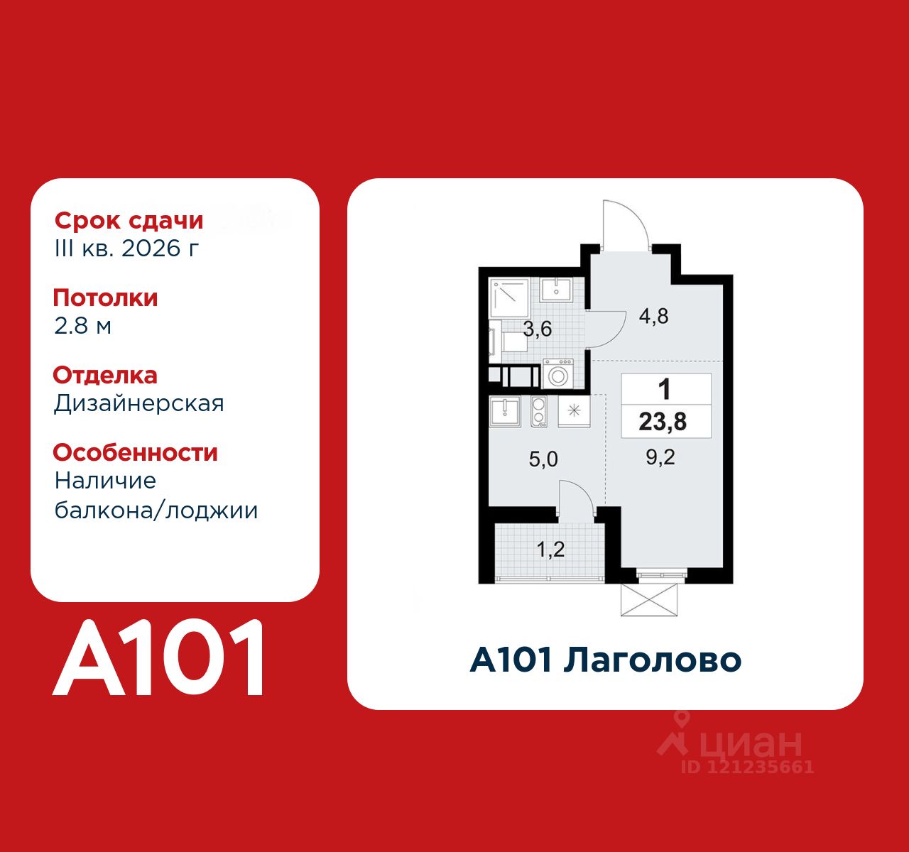 Студия площадью 23.80 в ЖК "А101 Лаголово" c лоджией на 8 этаже. Квартира с отделкой. Вид из окна на улицу. В квартире 1 санузел. Высота потолков 2.8 м.