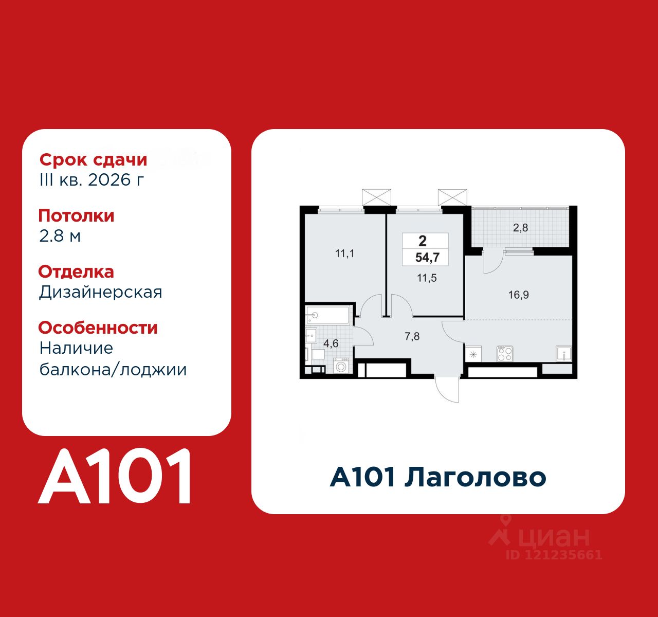 2-комнатная квартира площадью 54.70 в ЖК "А101 Лаголово" c лоджией на 12 этаже. Квартира с отделкой. Вид из окна на улицу. В квартире 1 санузел. Высота потолков 2.8 м. Ключи в 2025 году.