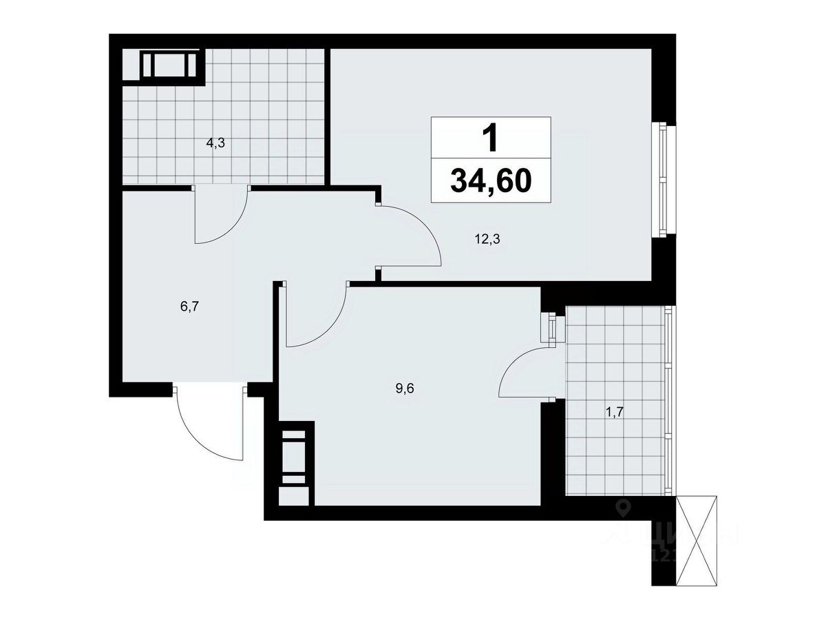 Общая площадь квартиры — 34,6 кв. м., этаж 3 из 9, секция 1