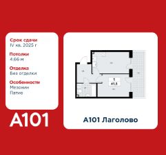 1-комнатная квартира площадью 41.50 в ЖК "А101 Лаголово" на 1 этаже. Квартира без отделки. Вид из окна во двор. В квартире 1 санузел. Высота потолков 4.66 м. Особенность планировки - мезонин и патио. Ключи в 2025 году.