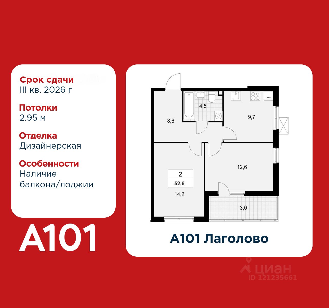 2-комнатная квартира площадью 52.60 в ЖК "А101 Лаголово" c лоджией на 2 этаже. Квартира с отделкой. Вид из окна во двор. В квартире 1 санузел. Высота потолков 2.95 м.
