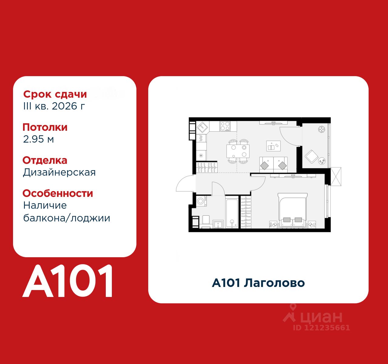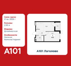1-комнатная квартира площадью 40.90 в ЖК "А101 Лаголово" c лоджией на 9 этаже. Квартира с отделкой. Вид из окна во двор. В квартире 1 санузел. Высота потолков 2.95 м.