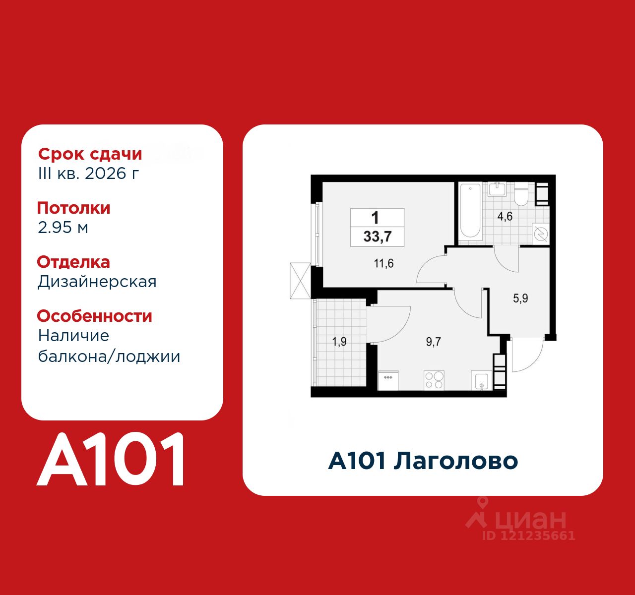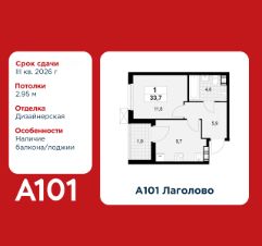 1-комнатная квартира площадью 33.70 в ЖК "А101 Лаголово" c лоджией на 9 этаже. Квартира с отделкой. Вид из окна во двор. В квартире 1 санузел. Высота потолков 2.95 м.