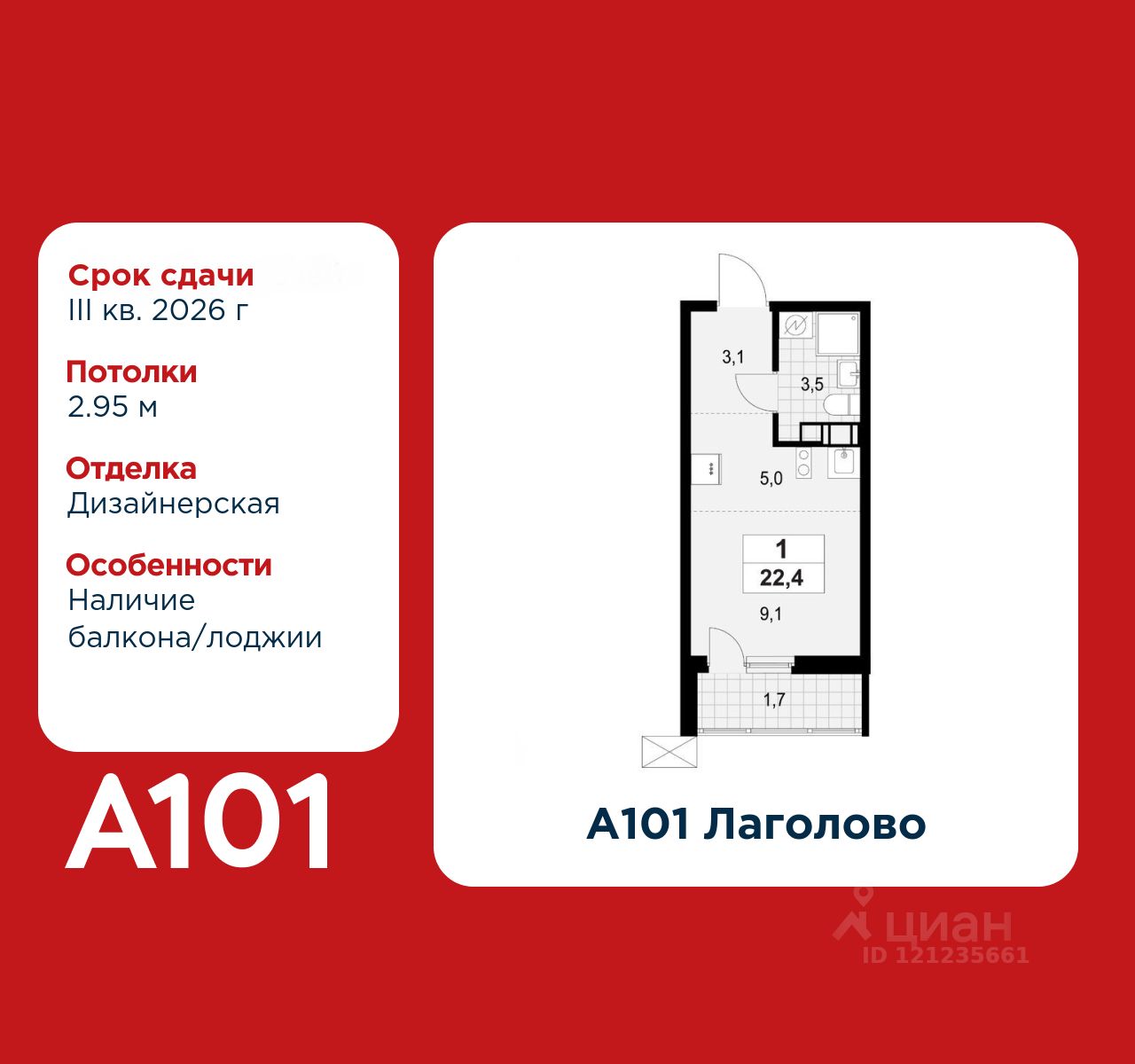 Студия площадью 22.40 в ЖК "А101 Лаголово" c лоджией на 9 этаже. Квартира с отделкой. Вид из окна во двор. В квартире 1 санузел. Высота потолков 2.95 м.
