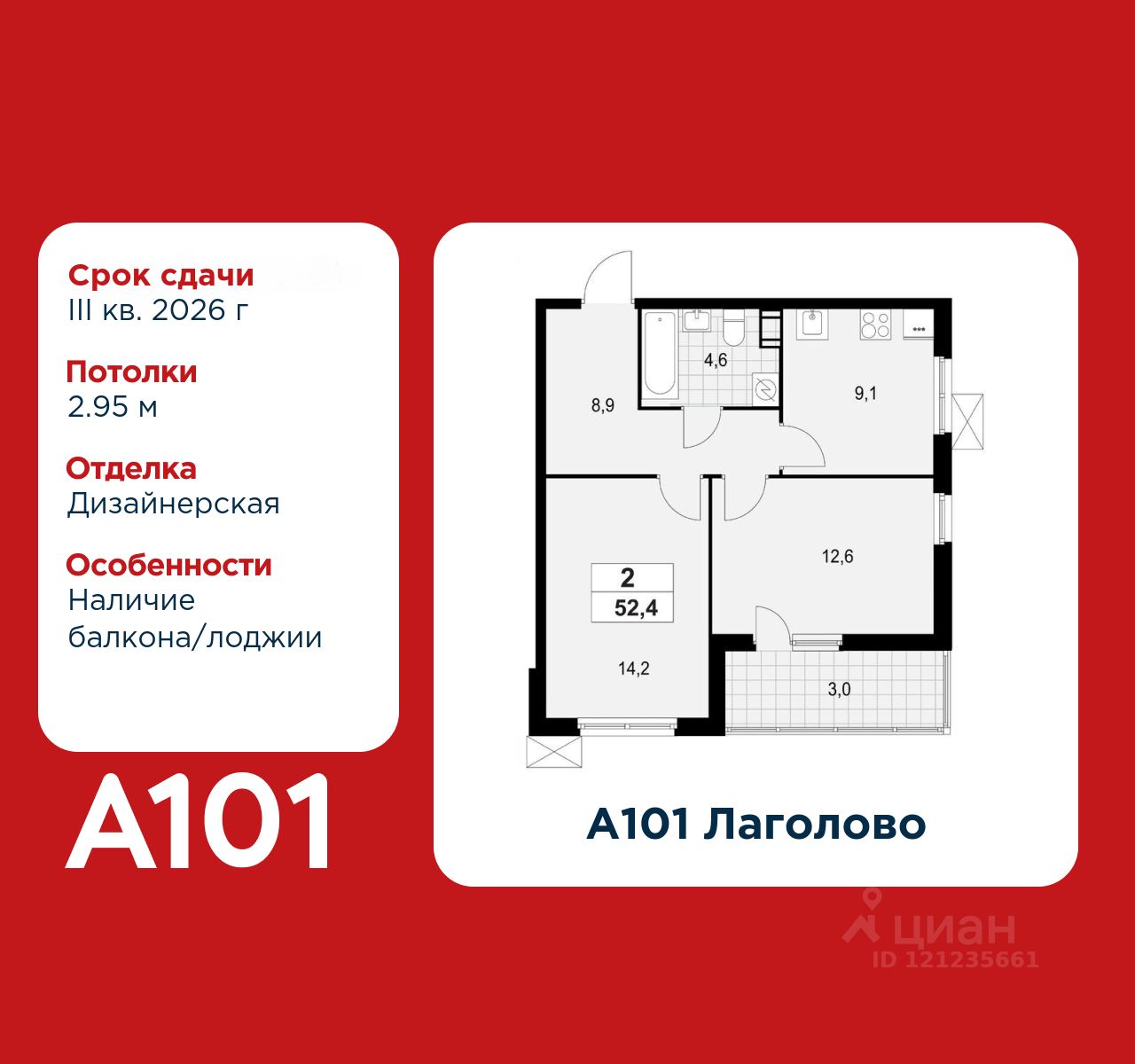 2-комнатная квартира площадью 52.40 в ЖК "А101 Лаголово" c лоджией на 6 этаже. Квартира с отделкой. Вид из окна на улицу. В квартире 1 санузел. Высота потолков 2.95 м.