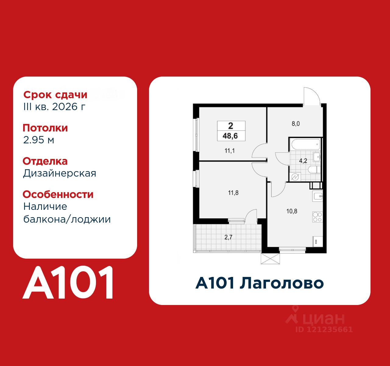 2-комнатная квартира площадью 48.60 в ЖК "А101 Лаголово" c лоджией на 7 этаже. Квартира с отделкой. Вид из окна на улицу. В квартире 1 санузел. Высота потолков 2.95 м. Ключи в 2025 году.