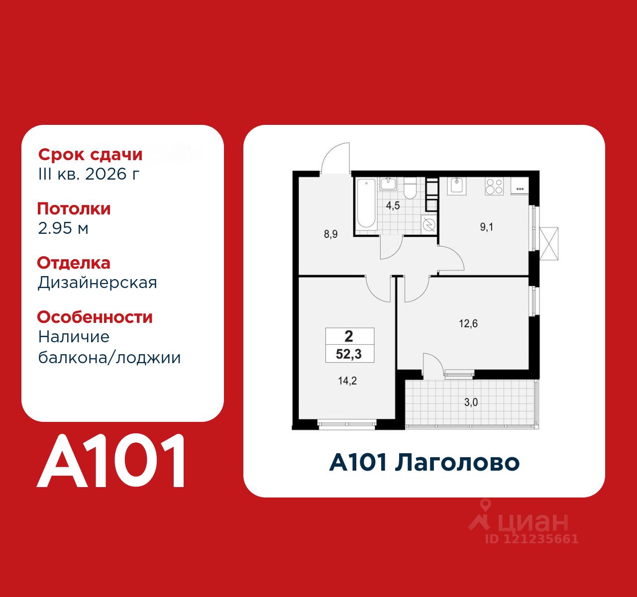 2-комнатная квартира площадью 52.30 в ЖК "А101 Лаголово" c лоджией на 10 этаже. Квартира с отделкой. Вид из окна на улицу. В квартире 1 санузел. Высота потолков 2.95 м.
