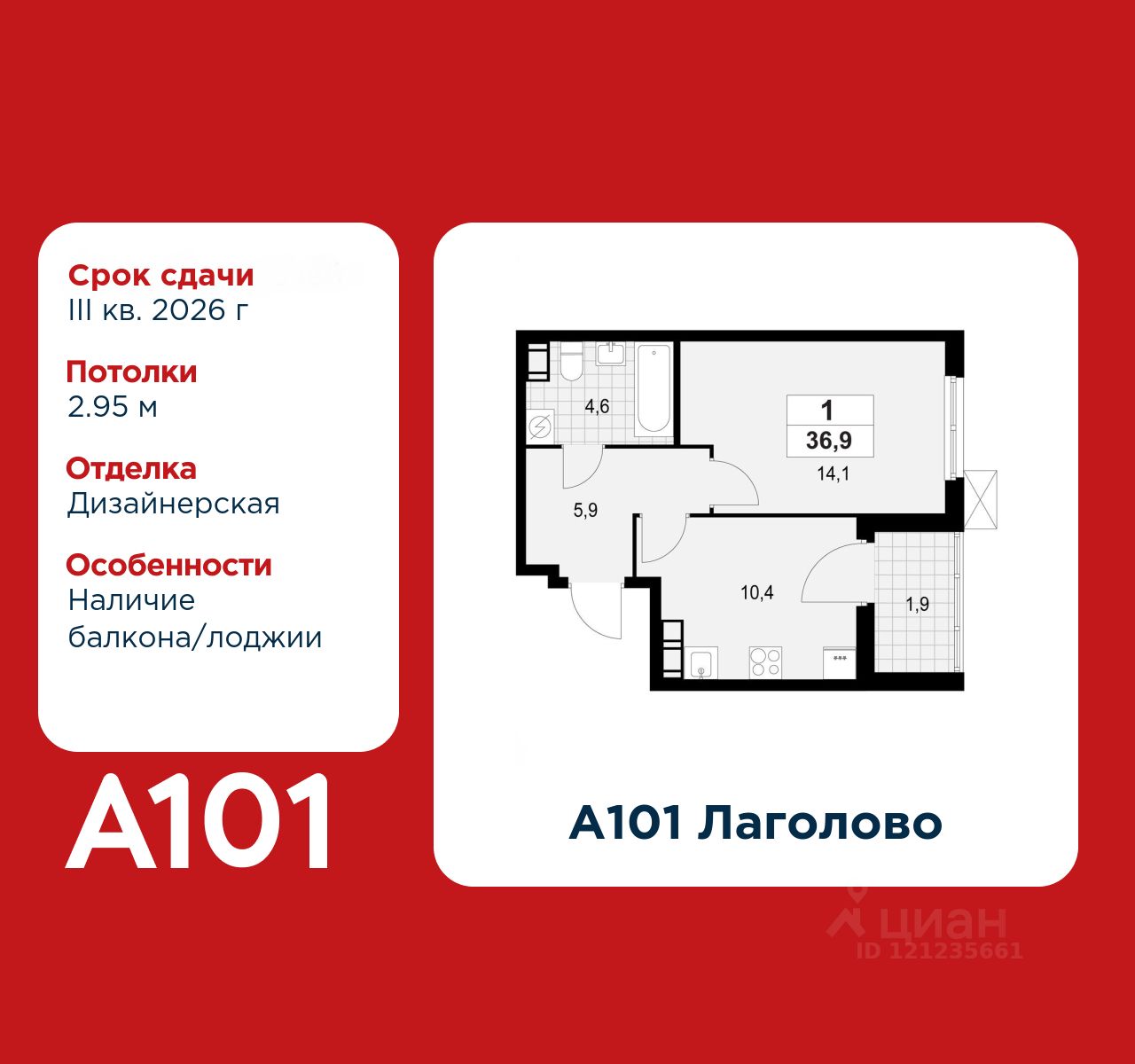1-комнатная квартира площадью 36.90 в ЖК "А101 Лаголово" c лоджией на 10 этаже. Квартира с отделкой. Вид из окна на улицу. В квартире 1 санузел. Высота потолков 2.95 м. Ключи в 2025 году.