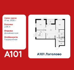 3-комнатная квартира площадью 67.10 в ЖК "А101 Лаголово" c лоджией на 12 этаже. Квартира с отделкой. Вид из окна на улицу. В квартире 2 санузла. Высота потолков 2.95 м. Особенность планировки - гардеробная. Ключи в 2025 году.