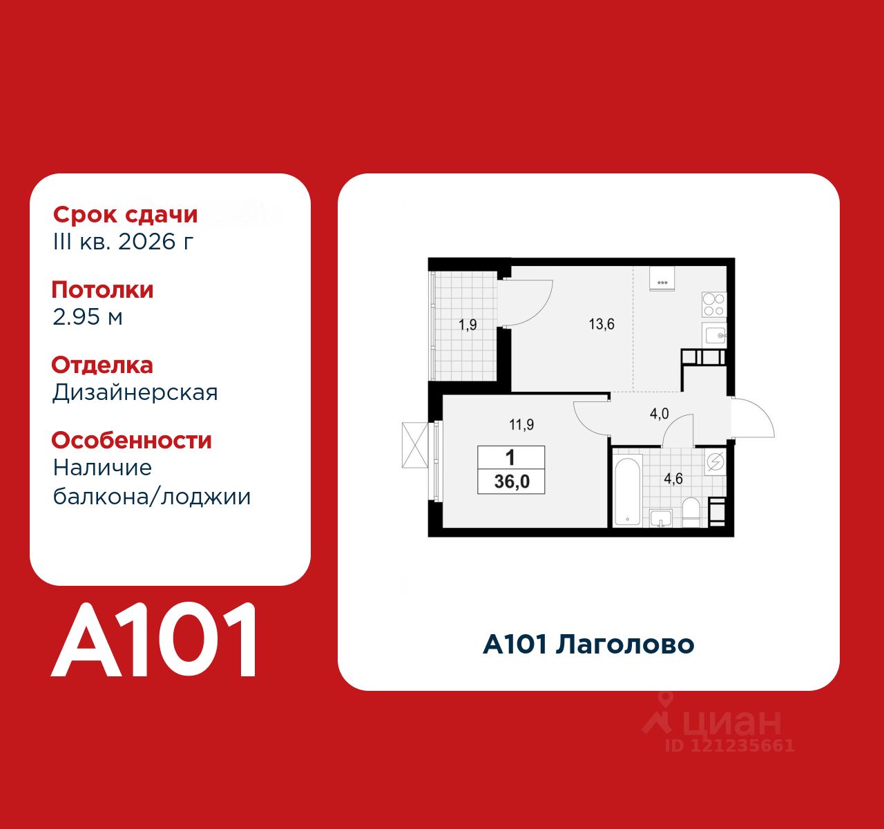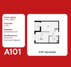 1-комнатная квартира площадью 36.00 в ЖК "А101 Лаголово" c лоджией на 12 этаже. Квартира с отделкой. Вид из окна на улицу. В квартире 1 санузел. Высота потолков 2.95 м.