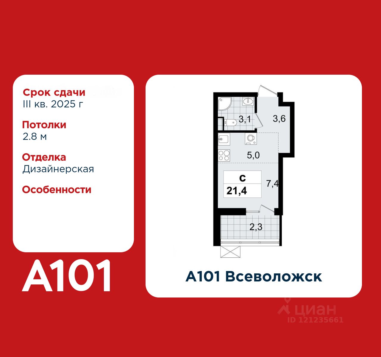 Студия площадью 21.40 в ЖК "А101 Всеволожск" c лоджией на 5 этаже. Квартира с отделкой. Вид из окна во двор. В квартире 1 санузел. Высота потолков 2.8 м.