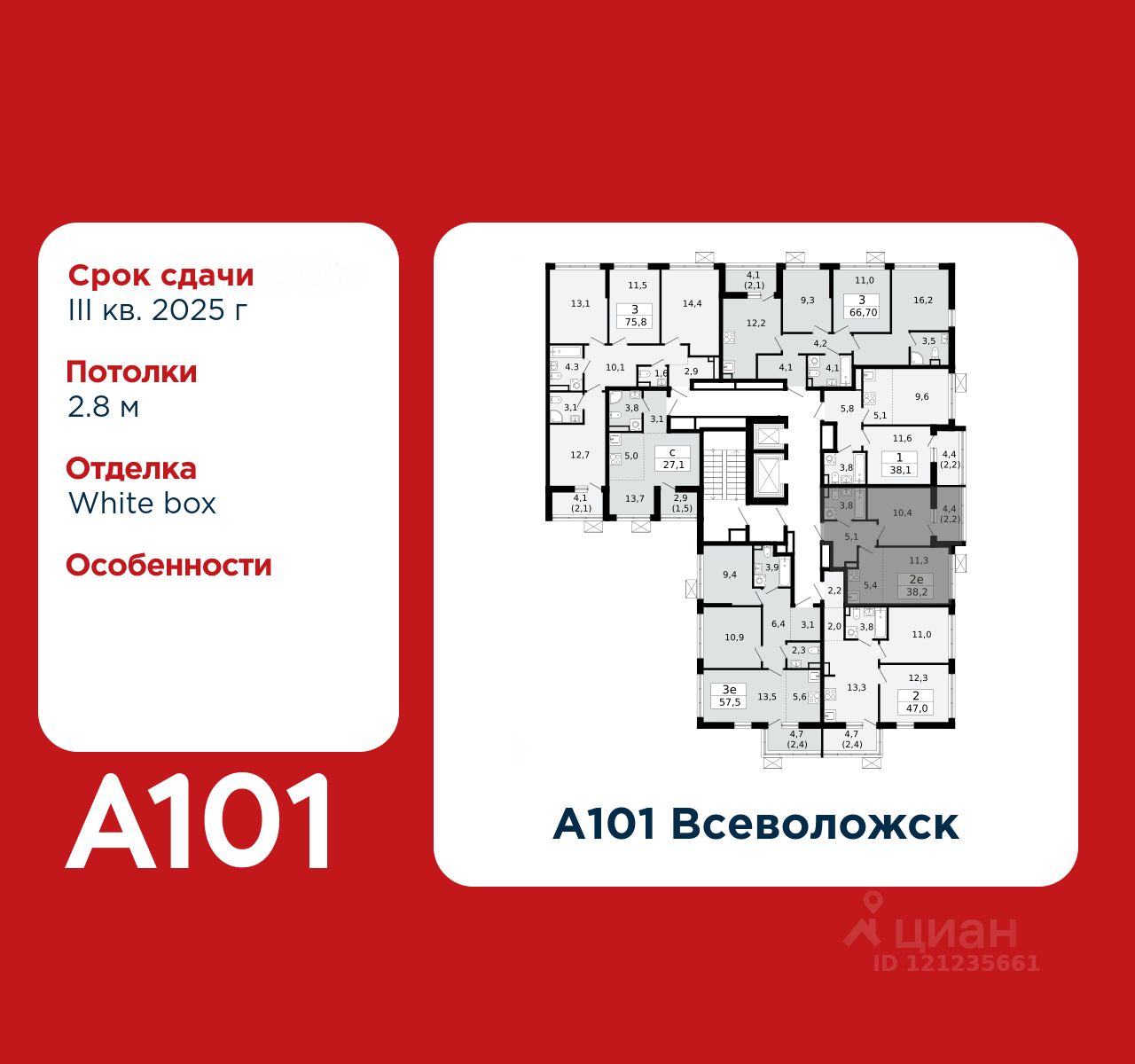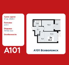 2-комнатная квартира площадью 38.20 в ЖК "А101 Всеволожск" c лоджией на 4 этаже. Квартира white box. Вид из окна во двор. В квартире 1 санузел. Высота потолков 2.8 м.