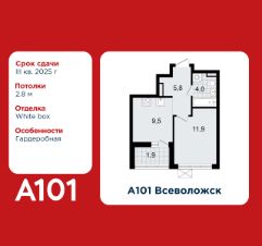 1-комнатная квартира площадью 33.20 в ЖК "А101 Всеволожск" c лоджией на 8 этаже. Квартира white box. Вид из окна во двор. В квартире 1 санузел. Высота потолков 2.8 м. Особенность планировки - гардеробная.