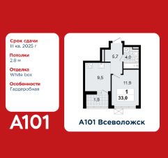 1-комнатная квартира площадью 33.00 в ЖК "А101 Всеволожск" c лоджией на 9 этаже. Квартира white box. Вид из окна во двор. В квартире 1 санузел. Высота потолков 2.8 м. Особенность планировки - гардеробная. Ключи в 2025 году.