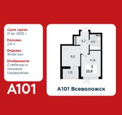 1-комнатная квартира площадью 33.00 в ЖК "А101 Всеволожск" c лоджией на 9 этаже. Квартира white box. Вид из окна на улицу. В квартире 1 санузел. Высота потолков 2.8 м. Особенность планировки - гардеробная. Ключи в 2025 году.