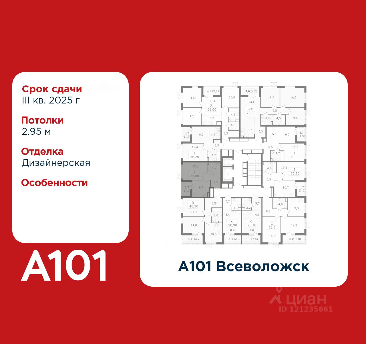 1-комнатная квартира площадью 33.00 в ЖК "А101 Всеволожск" c лоджией на 3 этаже. Квартира с отделкой. Вид из окна во двор. В квартире 1 санузел. Высота потолков 2.95 м.