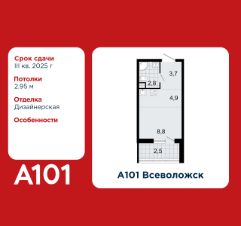 Студия площадью 22.50 в ЖК "А101 Всеволожск" c лоджией на 10 этаже. Квартира с отделкой. Вид из окна во двор. В квартире 1 санузел. Высота потолков 2.95 м.