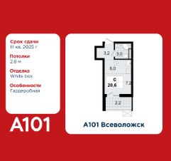 Студия площадью 20.60 в ЖК "А101 Всеволожск" c лоджией на 9 этаже. Квартира white box. Вид из окна во двор. В квартире 1 санузел. Высота потолков 2.8 м. Особенность планировки - гардеробная.