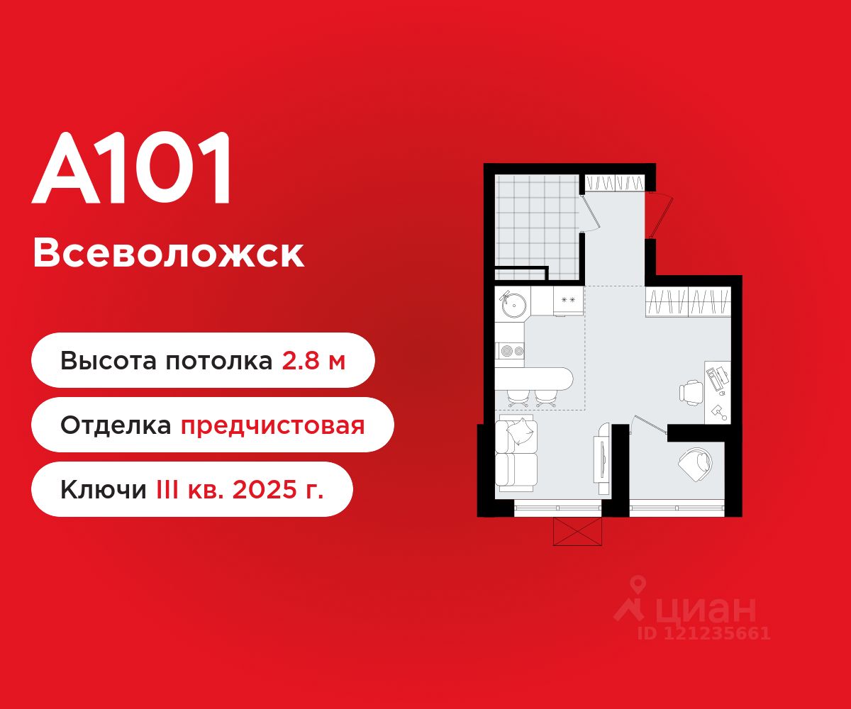 Студия площадью 26.90 в ЖК "А101 Всеволожск" c лоджией на 6 этаже. Квартира white box. Вид из окна во двор. В квартире 1 санузел. Высота потолков 2.8 м.