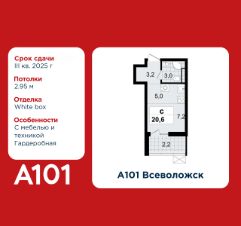 Студия площадью 20.60 в ЖК "А101 Всеволожск" c лоджией на 12 этаже. Квартира white box. Вид из окна на улицу. В квартире 1 санузел. Высота потолков 2.95 м. Особенность планировки - гардеробная.