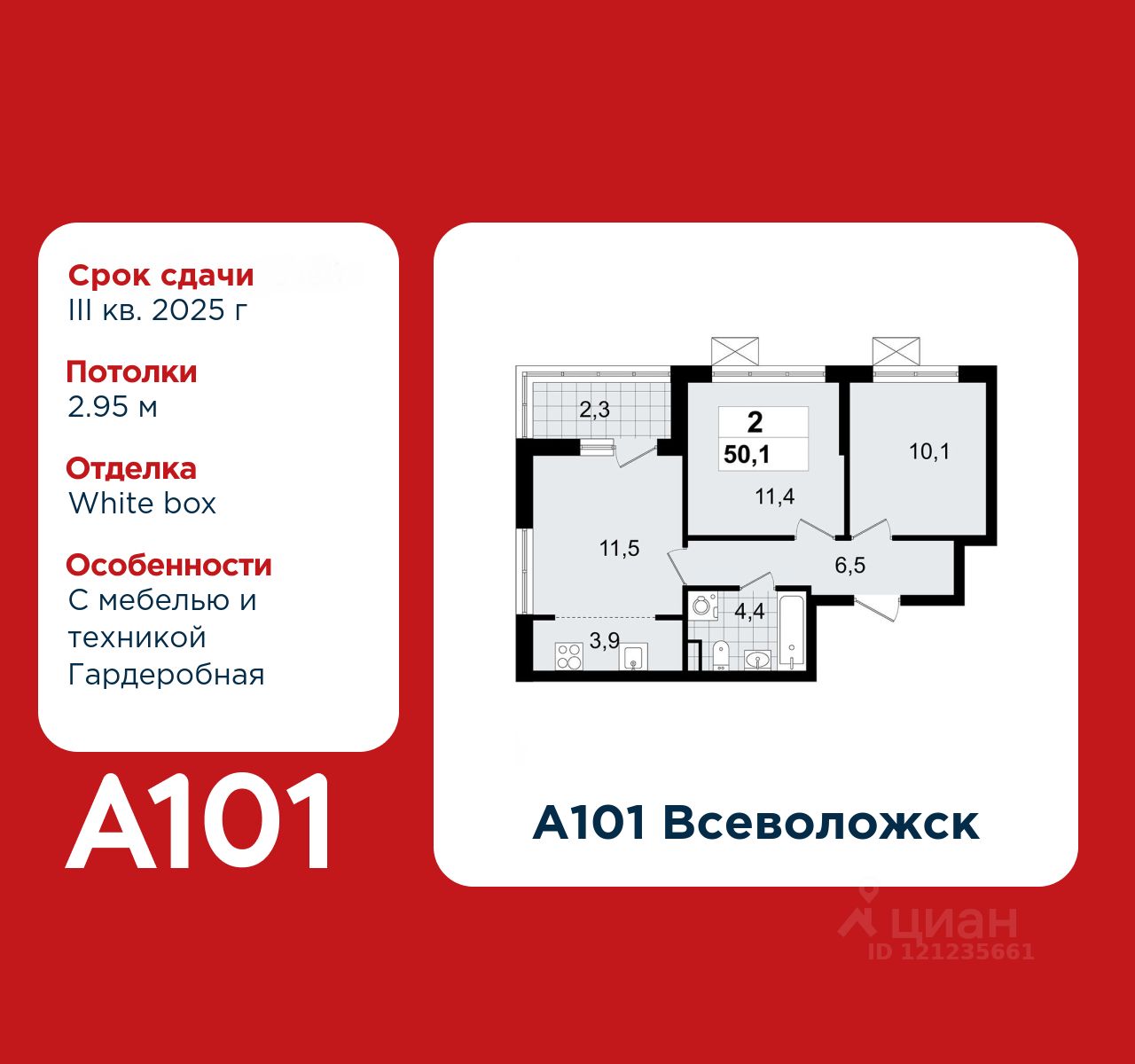 3-комнатная квартира площадью 50.10 в ЖК "А101 Всеволожск" c балконом на 12 этаже. Квартира white box. Вид из окна на улицу. В квартире 1 санузел. Высота потолков 2.95 м. Особенность планировки - гардеробная. Ключи в 2025 году.