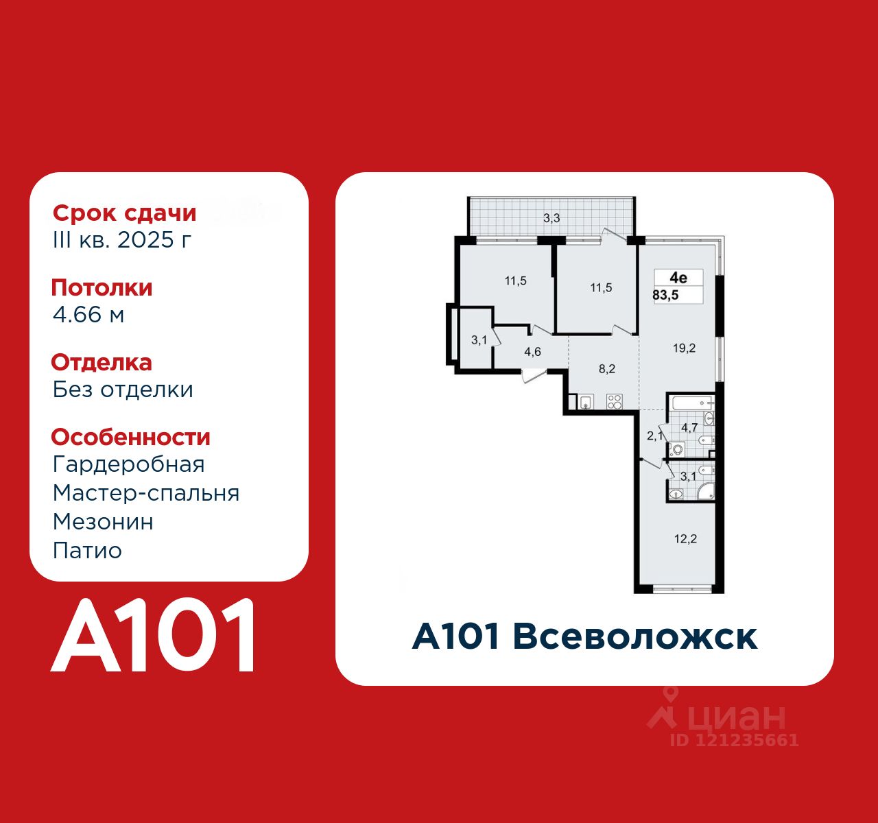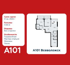 4-комнатная квартира площадью 83.50 в ЖК "А101 Всеволожск" c лоджией на 1 этаже. Квартира без отделки. Вид из окна во двор. В квартире 2 санузла. Высота потолков 4.66 м. Особенность планировки - мезонин и патио, гардеробная, мастер-спальня. Ключи в 2025 году.