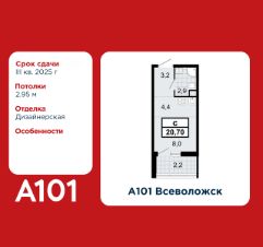 Студия площадью 20.80 в ЖК "А101 Всеволожск" c лоджией на 8 этаже. Квартира с отделкой. Вид из окна во двор. В квартире 1 санузел. Высота потолков 2.95 м.