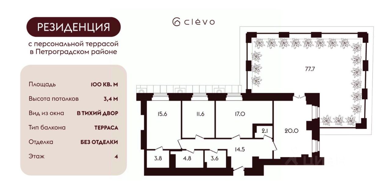 - Терраса: 77 м²