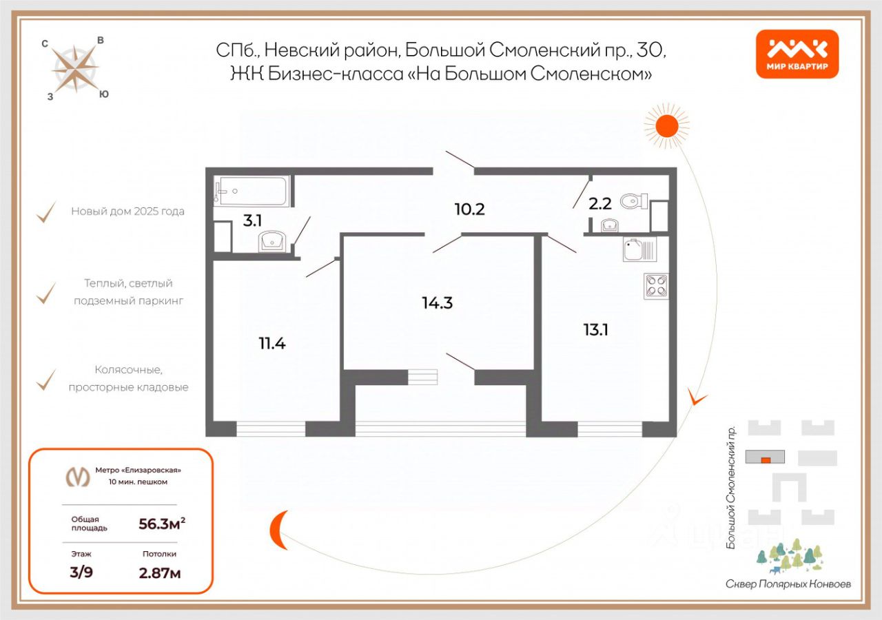 Арт. 118905439 Жилой комплекс "На Большом Смоленском" расположен в Невском районе Петербурга, всего в нескольких минутах ходьбы от метро "Елизаровская". Район активно развивается: здесь строятся современные жилые комплексы, появляются новые парки и объекты инфраструктуры, что делает локацию всё более привлекательной для жизни и инвестиций. До Невского проспекта на автомобиле всего 9 минут.